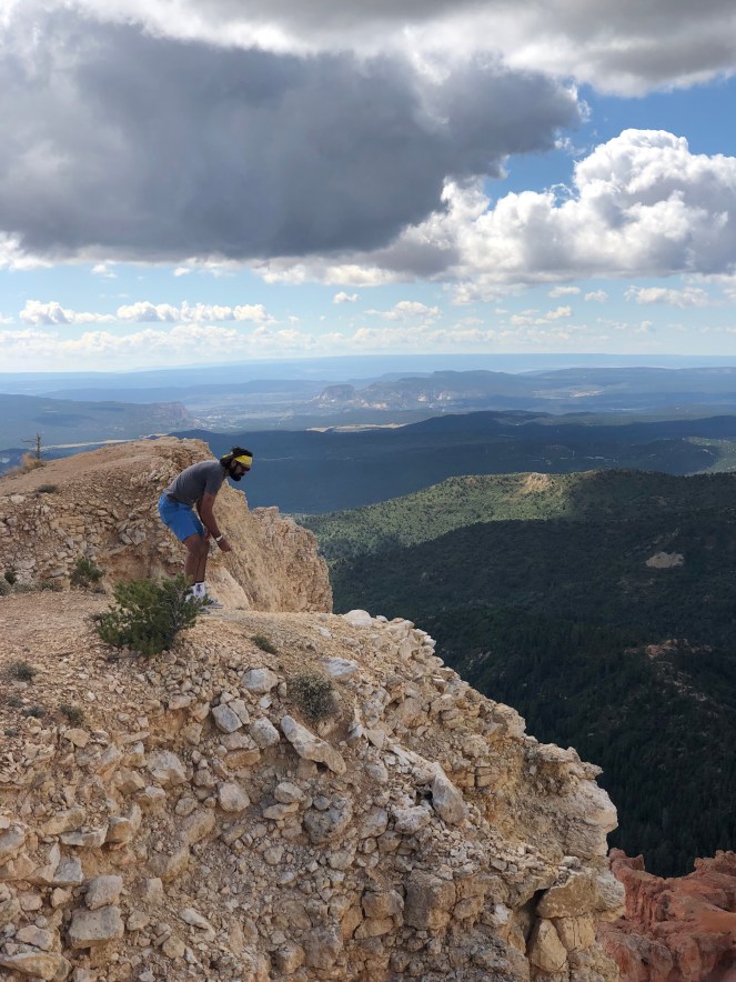 6. Hiking Rainbow Point in Bryce National Park at 9115 feet, 55 degrees, and 40 mph winds.