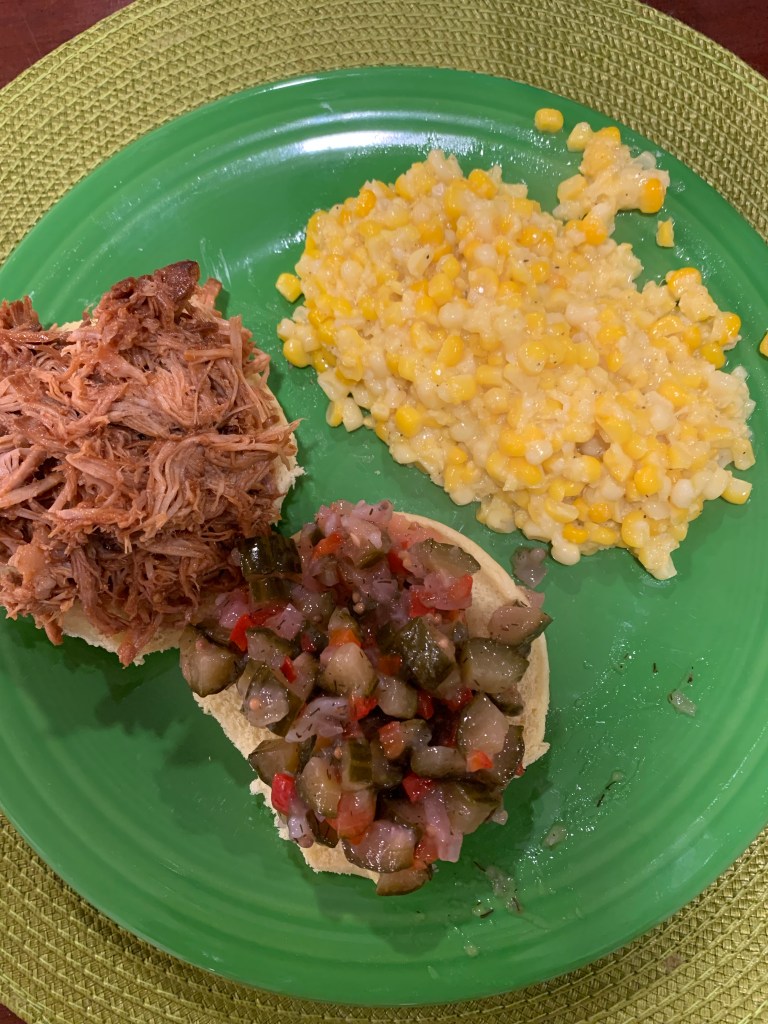 Lost in all of this overly serious self-journey talk, Christy has become an unbelievably creative chef, tossing in flavors here and there that reinforce Junior’s curiosity about how I am not 300 pounds. On the menu were fajita bowls, a tag-teamed shrimp and crab boil, fresh fish tacos they caught themselves the day before, and this chow chow relish over a pork shoulder recipe that I found in some bullshit flimsy flyer that landed in my mailbox.