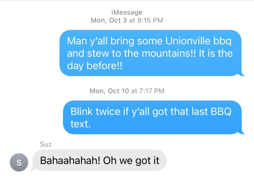 Regrettably, I have not partaken in the Unionville BBQ in a long, long time. First, I no longer live in North Carolina, and second, for whatever reason, the first weekend in November has become my jam. Five years ago this weekend, I ran my first New York City Marathon. Four years ago, I did it again. Three years ago, I vacationed just outside of Chattanooga, Tennessee at this beautiful place called Paradise Pointe with my family. Two years ago, I played golf throughout Arkansas and Missouri en route to Kansas City for the Panthers-Chiefs game with my friend Jay. Last year, with a seven week old in tow, we rented this little cabin in the woods, did a little leaf peeping, but in retrospect, it was a bust. (Why does anyone travel with a newborn?)