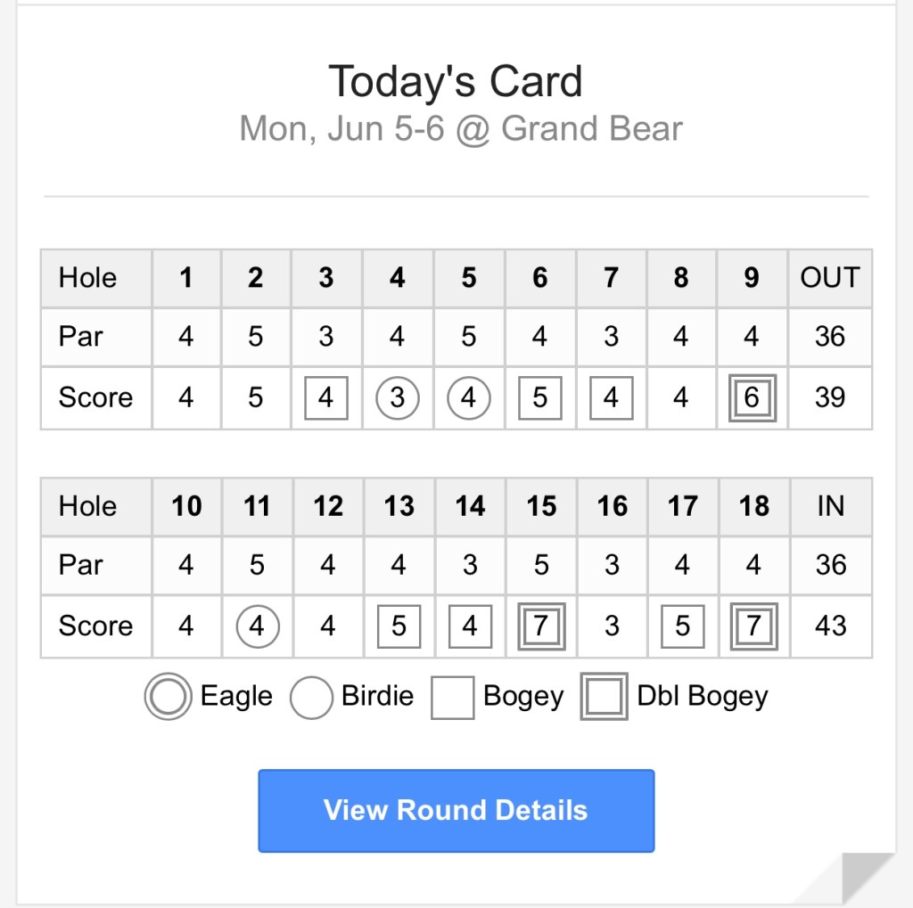 As my group approached the 17th hole on Monday, I was +8 through 16 holes on no birdies, four bogies, and back to back double bogies on holes 8 and 9. After having made six straight pars and surviving one lightning delay, I figured if I parred the last two holes, I would shoot 80 on the number and not completely embarrass myself.
