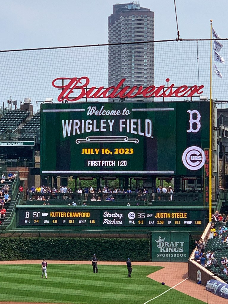 In a remarkable coincidence, the Cubs starting pitcher was from Lucedale, Mississippi, a town 45 minutes from where we live. Unfortunately, he got rocked. We saw multiple home runs, a grand slam, and before we knew it the score was 11-0 Red Sox. On the flip side, the Sox pitcher was brilliant, striking out nine and only giving up one hit. The pitching legend Rick Sutcliffe led us in Take Me Out to the Ballgame, and then things got a little weird for the last two innings.