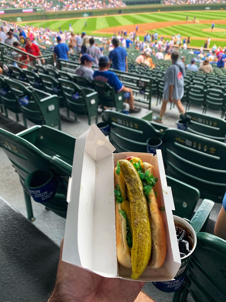 The first order of business was to get a Cubs hat. Next, a program. Next, Chicago hot dogs.